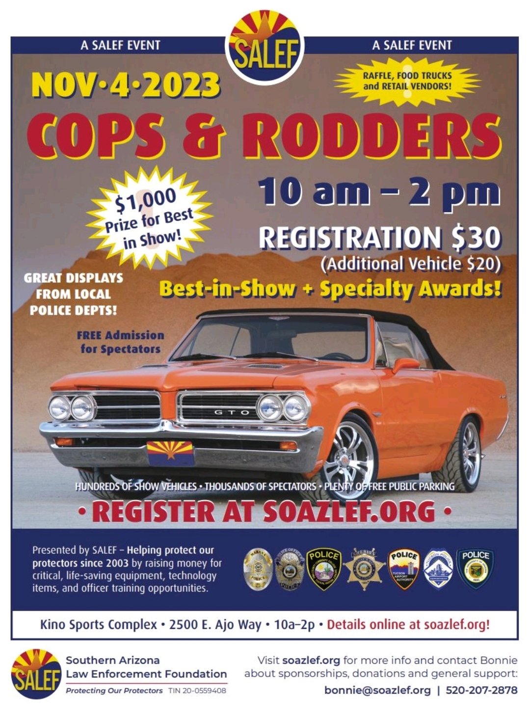 cops and rodders car show tucson 2024 – TUCSON, Ariz. (KVOA) โ The Tucson Police Department is hosting their Cops & Rodders Car Show this Saturday. The event will be Saturday, November 2nd from 10am to 1pm at the Kino Sports Complex . Please log in, or sign up for a new account and purchase a subscription to continue reading. If you are currently a print subscriber but don’t have an online account .